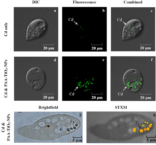 (a-f)添加纳米二氧化钛前后四膜虫细胞内镉的分布;(g)四膜虫细胞切片的显微成像;(h)同一个样品中钛的双能吸收衬度成像。