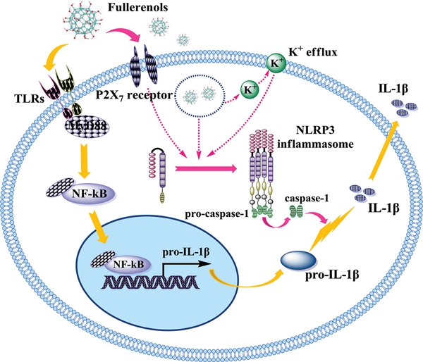 内包钆多羟基富勒醇(Gd@C82(OH)22)是一种具有高效低毒抗肿瘤作用的新型纳米材料,对免疫系统的调节是其发挥疗效的重要途径之一,但Gd@C82(OH)22激活和调控机体免疫的机制并不清楚。国家纳米科学中心陈春英课题组与上海光源软X射线显微成像站密切合作,结合同步辐射软X射线扫描透射显微技术(STXM)对巨噬细胞内Gd@C82(OH)22的摄入和定位进行成像分析,首次在分子水平揭示了金属富勒醇调节机体免疫的关键信号通路。研究发现,Gd@C82(OH)22与体内固有免疫细胞-巨噬细胞的相互作用在免疫调节过程中扮演着重要角色。Gd@C82(OH)22可被巨噬细胞大量摄入并将其活化,激活Toll样受体/MyD88/NF-ƘB和NLRP3免疫小体介导的信号通路,导致促免疫因子IL-1β的大量分泌,从而高效地调控天然免疫和获得性免疫。相关成果近期作为封面文章发表于纳米科学期刊Small杂志(PolyhydroxylatedMetallofullerenols Stimulate IL-1βSecretion of Macrophage through TLRs/MyD88/NF-κB Pathway and NLRP3 Inflammasome Activation. Small. 10(12), 2362–2372)。