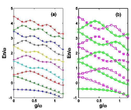 图2. 模型精确解与数值解的比较。(a,b)分别是模型在不同参数下的能谱精确解(线段)与数值解(星号和小方框)的比较,可以看到两者符合很好。