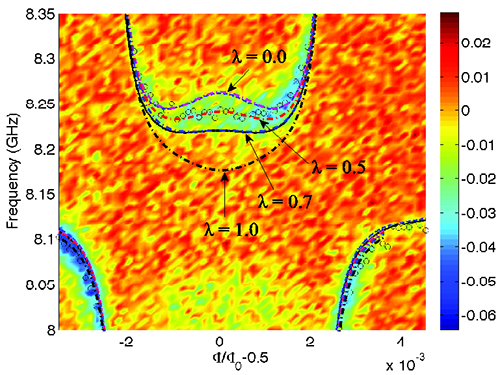 图3. 超强耦合超导量子比特实验数据与新模型结果的比较。超导量子比特可以和共振场超强耦合,从实验数据(图中小圆圈所示)可以看出,结果已经明显偏离采用旋波近似的JC模型(λ=0),而原来为大家熟知的拉比模型为λ=1,其结果也和实验数据有偏离。如果采用我们新引进的各向异性拉比模型,可以让λ=0.5,能谱与实验数据符合很好。