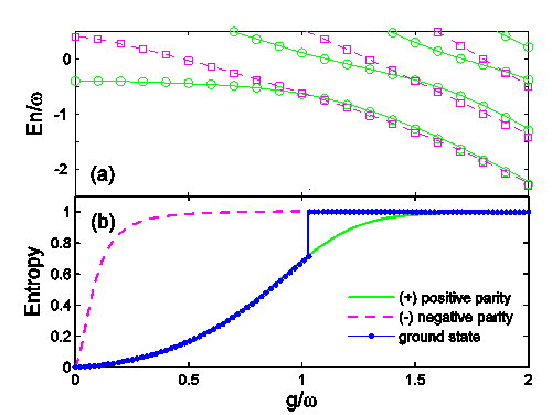 图4. 各向异性拉比模型可以展示出基态的简并行为,如虚线所示。此结果为原有拉比模型所不具备。在简并点系统量子比特的冯诺依曼熵(量子纠缠熵)存在跳变行为。