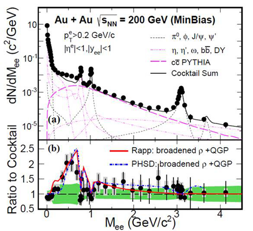 上图:双电子不变质量谱;下图:低质量区间的双电子增强