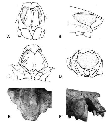 图1 猪属 (A)、(B) , 巨林猪属 (C) 和弓颌猪属(D—F)的吻部(侯素宽供图)