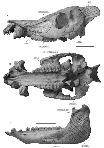 图2 弓颌猪属的吻部肌肉和咀嚼肌(侯素宽供图)