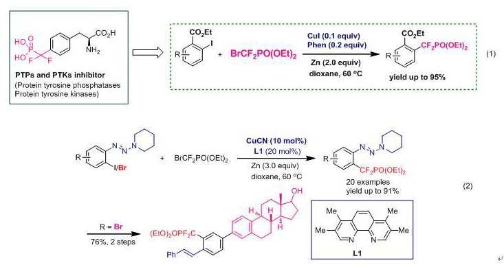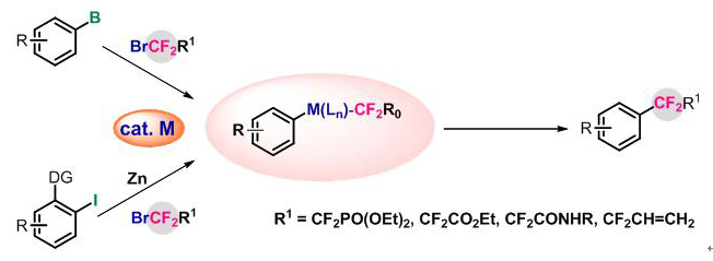 近年来随着医药、农药、材料等领域发展日益增长的需求,向有机分子中直接引入氟原子和含氟基团越来越受到关注,并发展成为国际与化学相关的研究热点之一。其中,芳烃的氟化和三氟甲基化反应在过去的几年中取得了突破性进展, 然而,长期以来芳烃的二氟烷基化却很少受到关注,与之相对应的引氟策略也十分少见。