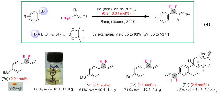 与此同时,以3-溴-3,3-二氟丙烯及其衍生物为氟源,该课题组实现了钯催化下有机硼化合物(芳基硼酸、烯基硼酸、芳基硼酸酯、芳基氟硼酸盐等)的偕二氟烯丙基化反应(eq 4, J. Am. Chem. Soc. 2014, 136, 1230)。该方法效率高、区域选择性好、底物普适性广、官能团兼容性出色、催化剂用量低。即使Pd催化剂用量低至0.01 mol%进行10克量级反应也不会明显影响反应效率和区域选择性。这是目前报道的第一例在如此低催化剂用量(0.01 mol%)下进行的实用性芳基氟烷基化反应。目前该方法被Merck公司新药研发所采用,并受到好评。