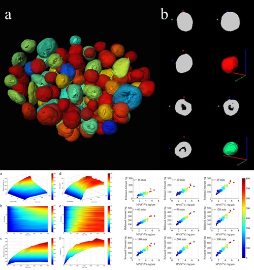 研究分析了从单胶囊所含的1000多个微丸中随机选取的74个单微丸的释放行为,与SR-μCT获得各微丸的体积、表面积、球形度和内部空腔体积、空腔表面积等内部结构3D参数相关联。结果显示单微丸的含药量、单位体积含药量、释放行为等指标差异显著;基于释放行为相似性,微丸聚类成体积差异的三类;微丸释放动力学与微丸表面积、单位体积含药量高度相关;释放符合经典控释模型;微丸内的空腔微结构对于药物释放过程影响显著。