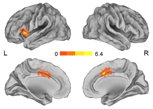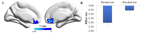 风险决策的研究发现,模拟微重力系统条件对被试的风险决策行为表现没有显著的影响。然而,影像数据显示,腹内侧前额叶皮层(VMPFC)的负激活程度在卧床后显著降低(图2)。此外,卧床前,获益结果所引发的VMPFC激活程度显著地高于损失结果所引发的激活程度;但卧床后获益和损失之间VMPFC的激活没有显著差异。由于在风险决策中VMPFC的活动性表征价值计算能力,这些结果表明,微重力系统条件会对被试的高级认知功能产生影响,卧床后被试的价值计算能力有所下降。静息态脑功能活动的研究发现,卧床后左侧前脑岛(aINS)和中扣带(MCC)的前部两个脑区的中心度(degree centrality)有显著下降(图3)。进一步,将上述两个脑区作为种子点的脑功能连接分析显示,与aINS和MCC有关的脑功能网络受到了模拟微重力的影响。具体来说,卧床后左侧aINS和中扣带、辅助运动区及其邻近的前额叶皮层的正连接强度有显著下降;卧床后MCC和左右脑岛、邻近额下回、右侧额上回及中央前回的正连接强度有显著下降;卧床后MCC和内侧额上回的负连接强度有显著下降。这些结果为模拟微重力系统条件可改变静息态脑功能活动提供了证据,并进一步提示模拟微重力系统条件尤其影响到与凸显事件的信息处理及自主神经功能相关的aINS-MCC脑功能网络。