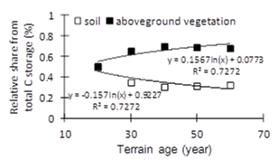 随着演替的进行,地上植被对生态系统的C贡献率逐渐增加,而在矿质土壤中这种贡献率却显著降低