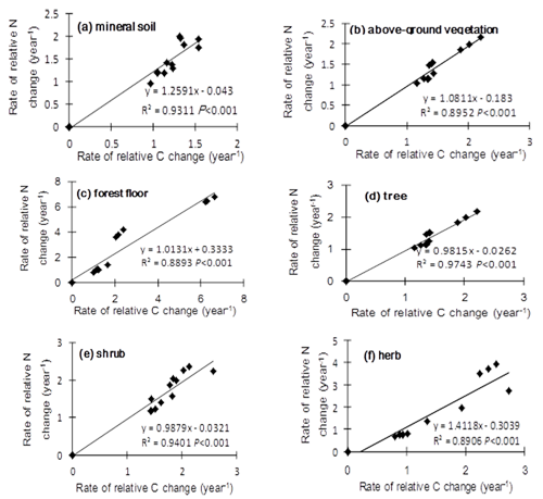 通过研究,结果显示:(1)在整个演替序列上,地上植被、森林地表物和矿质土壤均能积累碳和氮;(2)地上植被碳库对生态系统碳库的相对贡献率随着演替的进行而增加,然而矿质土壤的贡献率却逐渐降低;(3)随着演替的进行,地上植被中的碳和氮等速比例变化;(4)随着演替的进行,地上植被中碳:氮保持不变,矿质土壤中却降低,预示着更迅速的氮积累于矿质土壤中。以上的结果阐明了在整个演替阶段上增加的碳储存是伴随着氮积累的,并且地上植被是主要的生态系统碳库。当然,也需要考虑一部分碳从地下流失进入土壤。
