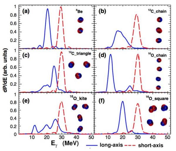 所谓巨偶极共振指的是由于原子核质子质心与中子质心分离导致的准周期集体运动,由于韧致辐射发射高能γ射线。通过对具有α团簇结构的 8Be,12C及16O GDR的计算,发现由于α团簇结构的存在,这些核的GDR谱劈裂成几个显著的峰。不同的α团簇结构对应各自相应的特征谱,这些GDR谱中峰的个数及中心能量可以利用α团簇构型的几何及动力学对称性给出很好的解释。30 MeV左右的GDR峰是α团簇的特征峰,可以用来诊断核中是否有α团簇自由度出现,而较低能量的峰可以用来区分不同的α构型。另外,12C和16O GDR谱中分别含有8Be和12C GDR谱的子结构,这种子结构的存在可以更准确地区分12C和16O的不同团簇构型。因此,GDR可以作为轻核团簇构型强有力的实验探针,它对团簇物理的发展具有重要的推动作用。