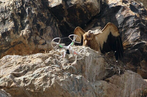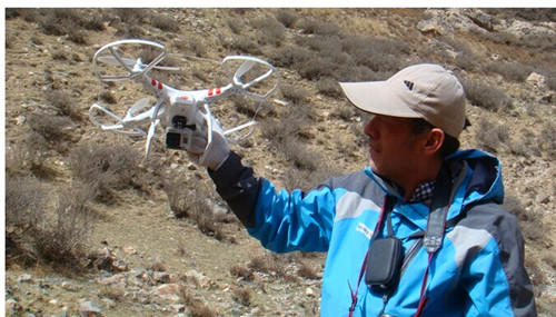马鸣研究团队采用六旋翼、四旋翼遥控无人机,在锁定崖壁上猛禽巢区后,无人机放飞至海拔3000米位置后,成功拍摄到巢中的亲鸟、雏鸟、巢的结构及环境照片和录像。不但降低了科研人员攀爬山崖的安全风险,还可从高空快速统计和获得高山兀鹫窝的结构、窝卵数、窝雏数、成活率、繁殖周期、幼鸟不同发育阶段等信息。这对于大型食腐猛禽的保育和研究无疑是有价值的探索和尝试。