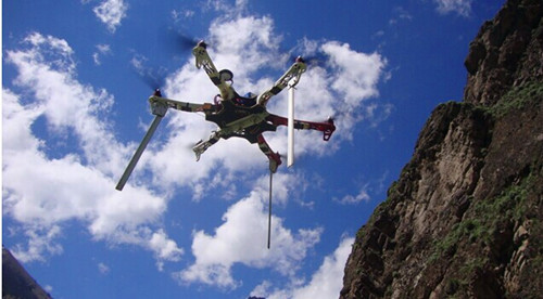 四旋翼遥控无人机携带微型相机正在拍摄高山兀鹫的窝