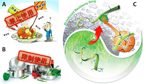 A) 含铝的食品添加剂已经被禁止使用。B) 铝制餐具已经被限制使用。C)铝离子结合在蛋白骨架上形成环状结构及其对蛋白二级结构的破坏。左下:正常的蛋白结构;右上:铝离子结合在蛋白骨架上形成的环状结构;左上:该骨架环状结构对蛋白结构的破坏。