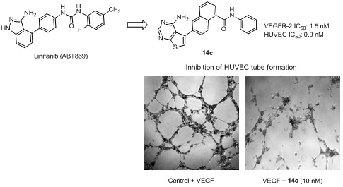 中国科学院上海药物研究所段文虎和丁健研究团队通过紧密合作,利用linifanib (ABT-869)为先导化合物,设计合成了一系列结构新颖的萘酰胺类VEGFR-2抑制剂。在这类抑制剂中,代表高活性化合物14c在酶和细胞水平均显示出很强的抑制活性。激酶谱测试表明,14c是一个多靶点抑制剂,对VEGFR-1, PDGFR-β 和RET也有较强的抑制活性。此外,化合物14c在HUVEC管腔形成实验中,显示出较强的抗内皮细胞管腔形成能力。