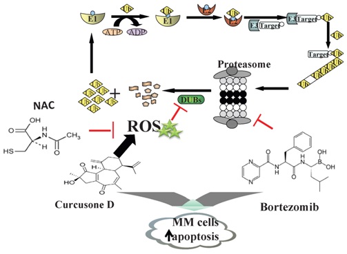 天然产物Curcusone D抑制泛素-蛋白酶体降解通路及抗多发性骨髓瘤作用机制示意图