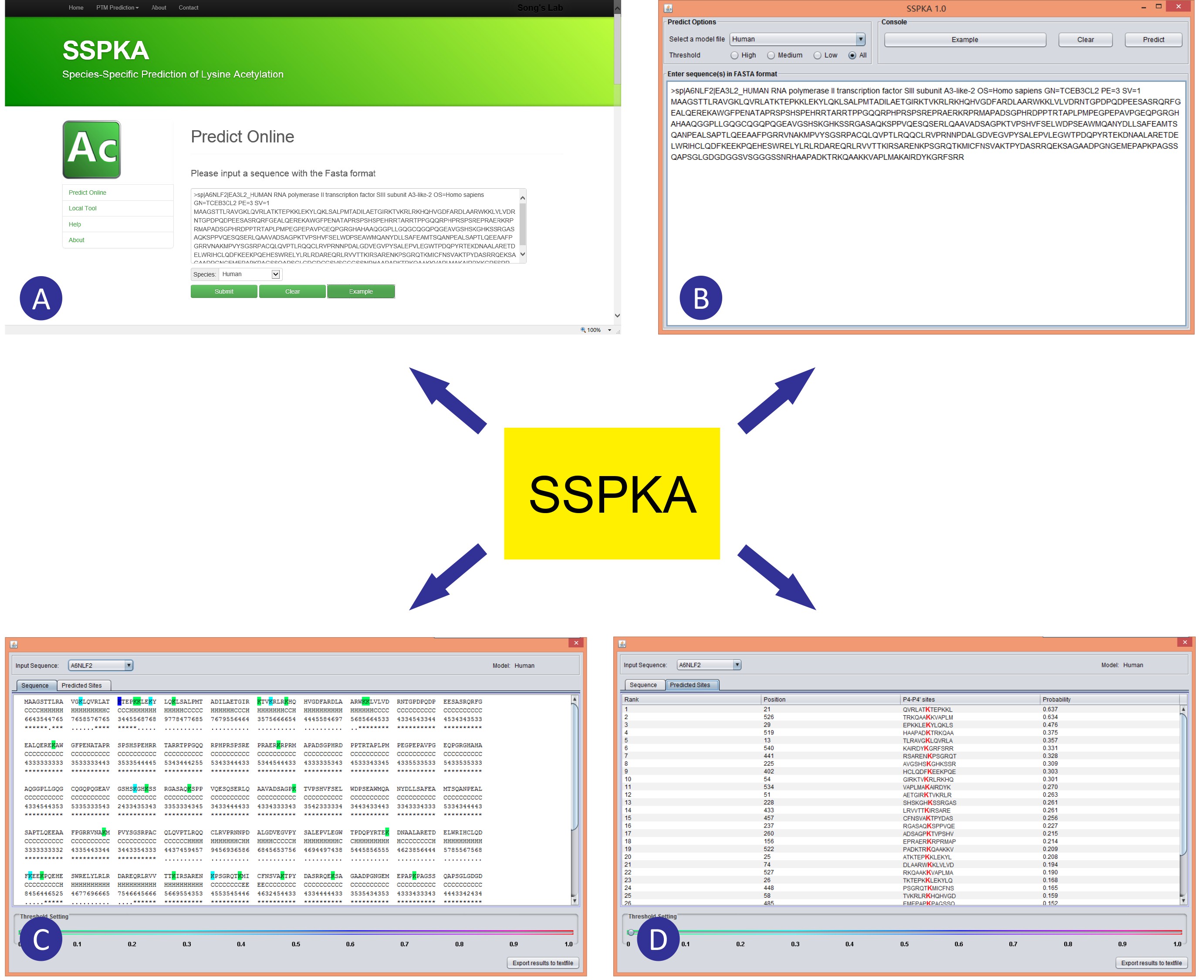 生物信息学工具SSPKA的在线网络服务器和本地Java工具使用界面和结果输出示例的屏幕截图。(A) 网络服务器截屏; (B) 本地Java工具查询序列提交界面;(C)和(D) 本地Java工具的预测结果输出示例截图。