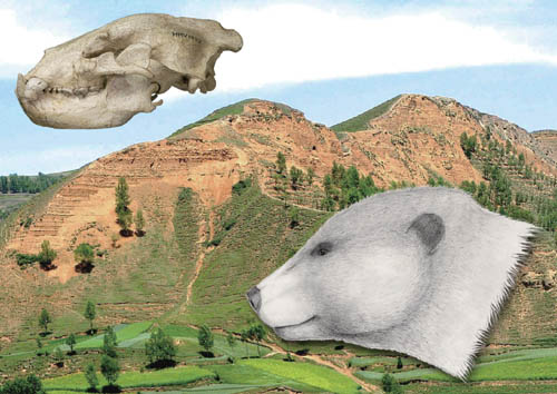 图1 戴氏祖熊头骨化石及其头部复原(史勤勤绘),背景为临夏盆地晚中新世的三趾马红土(邓涛摄)