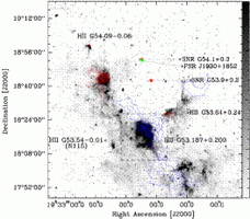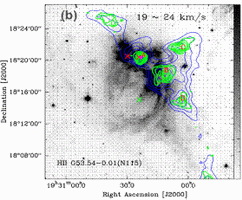 中国科学院国家天文台和紫金山天文台青海观测站的研究者利用紫金山天文台青海德令哈观测基地13.7米望远镜对H II区G53.54-0.01(N115)进行了CO分子谱线的观测。通过成图观测,发现HII区G53.54-0.01的红外8微米辐射与一个大尺度红外Bubble在视向上重叠。特别重要的是在该H II区周围共探测到4个分子云核,在其中的三个云核中探测到被HII区G53.54-0.01膨胀堆积的气体,有趣的是在另一个云核中不仅没有探测到被堆积的气体,而是在该云核中探测到了分子外向流。分子外向流是恒星形成的标识。通过计算,存在分子外向流的云核具有大的质量,进而说明该核存在一个正在形成的大质量恒星,该大质量恒星可能是被H II区G53.54-0.01通过collect and collapse过程触发形成的。该工作即将发表于天体物理杂志A&A。
