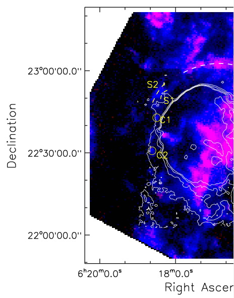 图1. 13CO积分强度为红色,12CO积分强度为蓝色,contour图为射电1.4GHz连续辐射。