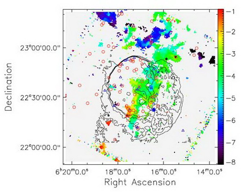 利用中国科学院紫金山天文台青海观测站13.7米毫米波射电望远镜,科研人员对超新星遗迹IC 443进行了CO三条分子谱线的观测。整个OTF观测覆盖了2.25平方度的天区,首次揭示了环绕这个超新星遗迹北部的连续分子壳层结构和遗迹东侧的离散分布的分子云团块结构(f7a)。认证出具有【-5,-2】km/s的分子云气体与这个超新星遗迹有物理联系并且位于遗迹的前景(f11b)。利用WISE和2MASS红外数据,科研人员还发现了62个年轻星候选体聚集在IC 443的视场内,这些年轻星候选体主要集中在超新星遗迹的射电辐射边缘,很可能是被遗迹的前身星的剧烈活动(例如紫外辐射,星风等)触发的。