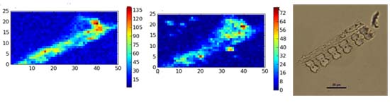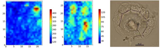 图1: 水稻叶片植硅体钾和钙元素面分布规律 (标尺=20微米,吴妍供图)