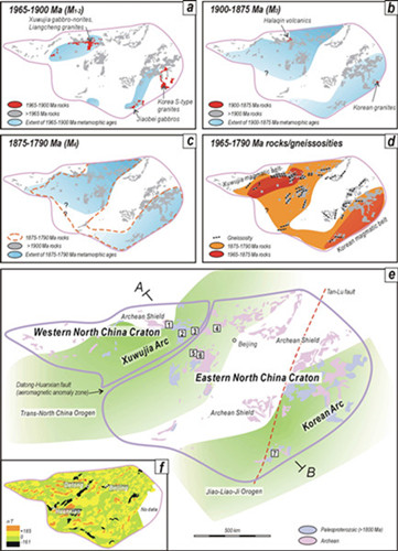 前人研究认为,华北古陆通过更古老的陆块在19亿年前拼贴而成,这是20多年来我国前寒武纪地质研究取得的重大进展之一,但对于拼合前的海陆格局,存在不同看法。中国科学院地质与地球物理研究所岩石圈演化研究室彭澎研究员及合作者在研究和统计岩浆岩时空分布的基础上,对变质地体进行了进一步的统计和分析。时间维度的分析表明,华北古陆19.5-18.0亿年前的高级变质地体(变质温度>700-800℃)大致记录了两个变质阶段:第一阶段发生在19.6-19.0亿年前,包含两个峰期,分别为19.5和19.2亿年前;第二个阶段发生在19.0-18.0亿年前,也有两个峰期,分别为18.8和18.5亿年前。空间维度的分析表明,高级变质地体集中分布在两个带状区域:一个位于华北中西部,可能穿过鄂尔多斯盆地,另一个位于华北东缘(图a-c)。此外,第一阶段变质作用的地温梯度更高,但分布范围较局限,并且都叠加了第二阶段的变质作用。这些数据限定了古陆拼合造山带的延伸方向(图e)。结合岩浆岩的时空分布特征(图a-d),第一阶段(19.6-19.0亿年前)构造-热事件可能对应着一次类似现今的弧-陆拼贴过程;第二阶段(19.0-18.0亿年前)则可能对应着一次陆-陆拼合过程。