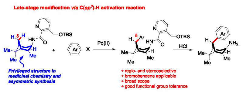 蒎烷胺类化合物具有良好的抗流感活性、抗菌活性,其骨架在不对称合成中也有广泛应用。但是由于其骨架的特殊性,对其结构中氨基δ位的桥环修饰成为难点,并从未有报道。该团队通过在蒎烷胺的氨基上引入特殊定位基团,用二价钯催化的C(sp3)−H活化反应在蒎烷胺的氨基δ位引入了不同的芳香取代基,最后再脱去定位基团得到δ位芳香取代的蒎烷胺。该反应具有以下特点:良好的立体及区域选择性、广泛的底物适用性及良好的官能团耐受性。