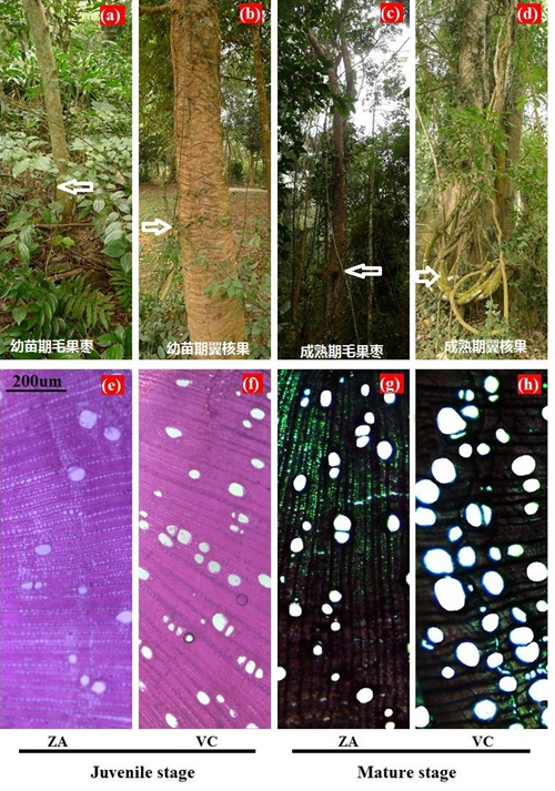 不同生长阶段两种藤本外形及解剖特征差异。ZA,毛果枣; VC,翼核果