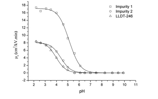 中国科学院上海药物研究所陈东英课题组采用压力辅助毛细管电泳法实现了对雷公藤衍生物LLDT-246及其杂质pKa的同时检测(J. Pharm. Biomed. Anal, 2014, 88, 22–26)。通过加压的方式克服了酸性化合物,由于低pH下电渗流低,导致分析时间过长甚至不出峰的困难,同时采用毛细管电泳法也弥补了滴定法和光谱法只能用于测定具有高纯度的化合物pKa的缺陷。该项技术的建立和运用将为高通量测定候选药物的pKa提供便利,且尤其适用于早期纯度低的化合物pKa的测定。