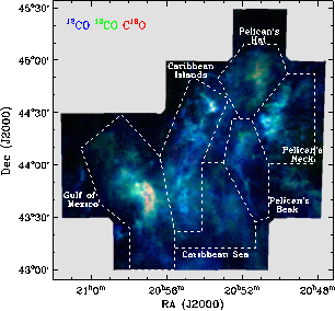 图1 12CO(蓝)、13CO(绿)、C18O(红)三色积分强度合成图