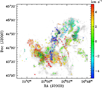 图2 分子云团块认证结果,颜色表示速度,大小表示云核尺寸,背景为13CO积分强度灰度图