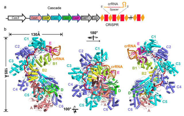 该结构显示,61个核苷酸的crRNA横跨Cascade的11个亚基,并与6个CasC亚基相互作用,5’和3’末端分别被CasD和CasE锚定。CrRNA的间隔区序列定位在CasC1-6亚基形成的连续的沟槽中。来自CasC2-6的5个长β发卡结构穿过crRNA。因此crRNA被分成5个片断,每个片段包括5个堆叠的碱基和一个翻转的碱基。每一个crRNA间隔区片断通过相似的方式与CasC相互作用。进一步的研究显示,crRNA不仅在靶点识别中发挥重要作用,而且也在Cascade的组装中发挥重要作用。该研究为Cascade如何发挥功能提供了重要依据。