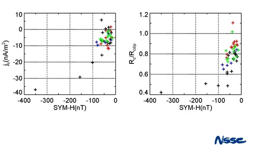 环电流(左)及磁场曲率(右)随磁暴强度变化的统计结果