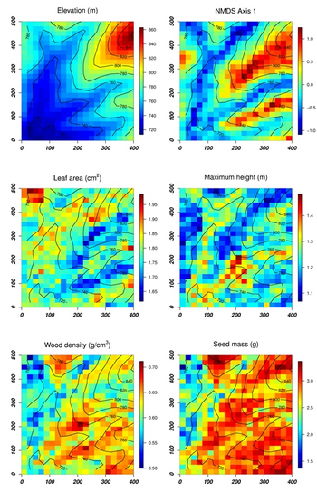 中国科学院西双版纳热带植物园群落生态和保护研究组博士研究生刘佳佳在导师Ferry Slik指导下通过收集西双版纳补蚌大样地(地形条件复杂)内植物的功能性状数据,结合大样地环境数据进行分析。他们发现,地形对于物种组成具有显著的影响(相关性高达65.3%),在沟谷地区,植物以大叶片、高(潜在)树高的物种为主,这类植物通常具有较快的生长速率;而在山脊地区,则以木材密度高、种子大的物种为主,以适应干旱环境。功能多样性指数如功能均匀度和发散度也呈现在沟谷地区为高的趋势,体现了不同生境下植物生存策略的分化。在养分水分条件较好的状况下(如沟谷),植物间以竞争为主;而在养分水分较差的状况下(如山脊地区),则以环境过滤作用主导植物策略的选择过程。