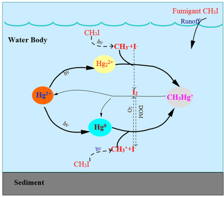 环境水体中碘甲烷对无机汞的光化学甲基化机理示意图