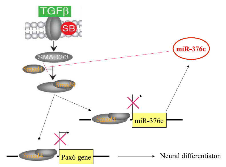 miR-379-656簇,在人类基因组中定位于14号染色体的印记基因 DLK-DIO3区域,包含约50个miRNA,在哺乳动物中保守性很高,其表达主要存在于胚胎和大脑,但是其具体调控功能并不清楚。该研究表明,miR-376c可以靶向SMAD4从而抑制SMAD4的表达。SMAD4因子是TGF-β 信号通路中的重要介导因子,它可以将胞外的TGF-β信号转导到细胞核内,再起到调节TGF-β 信号下游基因表达的作用。TGF-β 信号已经被证实在抑制神经发育和分化,在人多能干细胞的多能性维持、在iPS细胞的诱导早期等各方面具有重要作用。进一步的研究表明,人多能干细胞培养中所需要的TGF-β信号通路可激活SMAD4作为转录因子结合到人神经干细胞标志基因PAX6启动子上游和人miR-376c基因启动子上游,从而抑制了PAX6和miR-376c基因的转录。