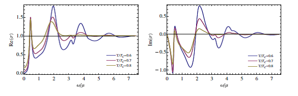 以上两图分别给出了不同温度下全息电荷密度波电导率的实部和虚部。实部中第一个峰代表了集体钉扎模式,第二个峰为单粒子有隙激发。其直流电导随温度降低而减小,实现了金属到绝缘体的相变。