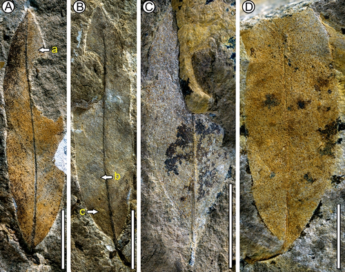 图1. 发现于藏东上中新统地层中的西藏胡颓子(E. tibetensis T. Su et Z. K. Zhou)叶片化石