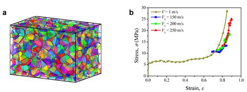 闭孔泡沫金属的三维Voronoi模型(a)和准静态/动态应力-应变关系(b)