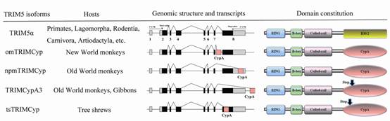 宿主与病毒的共同进化和博弈是病毒学家和进化学家长期感兴趣的研究课题。宿主中存在的病毒限制因子可直接作用于HIV病毒,破坏病毒正常的生活周期以达到限制病毒复制的作用。目前发现的HIV病毒限制因子有APOBEC3G、TRIM5α/TRIMCyp、ZAP、Tetherin、SAMHAD1、Mx2等。其中,TRIMCyp是比较特殊的一种HIV病毒限制因子,它由CypA基因通过逆转录作用插入TRIM5基因座形成了TRIMCyp融合基因后经选择性剪接得到。