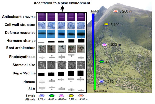 中国科学院昆明植物研究所杨永平研究组与胡向阳研究组的博士生马岚,利用青藏高原广泛分布的物种钉柱萎陵菜(Potentilla saundersiana)为实验材料,以建立在西藏当雄县的定点观察站为实验样地,该观察站分布有五个不同海拔的观察点(4350m,4600m,4800 m,5100m,5200m )。结合观察点的气象数据进行主成分分析表明温度与土壤水分是两个最主要的影响植物生长量的主效因子。对五个不同海拔的观察点的钉柱萎陵菜进行采样综合分析,形态分析结果表明钉柱萎陵菜的叶片面积、气孔大小与气孔密度都随着海拔升高而减少,但叶片细胞壁却随着海拔升高而增厚,暗示叶片形态的进化对高海拔环境的适应;蛋白组学分析五个不同海拔点的样品获得118个差异蛋白点,这些差异点涉及到抗氧化反应、脯氨酸与糖代谢以及激素代谢等,同时涉及到蛋白翻译后调控与表观遗传途径相关蛋白;生理生化分析表明植物体内抗氧化酶系统随着海拔梯度的升高而增强。综合以上形态学、生理生化与蛋白组学结果表明:在长期的适应性进化过程中,钉柱萎陵菜采取多种策略来增强自身对逆境胁迫的适应能力。