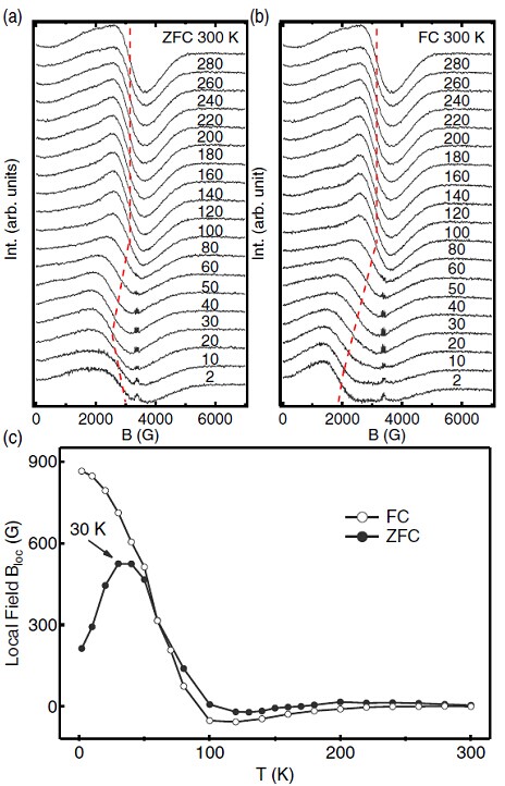 ZFC和FC电子自旋共振谱以及计算出的等效局域场,反映出其中弱铁磁的出现和演化