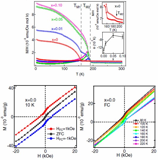 印第安纳大学张世雄助理教授及其合作者考虑到从相对简单的体系出发(并且由于理论已有预言这个化合物在全进全出的磁基态下是一个Wely半金属),合成了Y2Ir2O7以及Ca(空穴)掺杂的样品,通过磁性、电子自旋共振、电输运、X射线光电子能谱等测量对这两个样品作了系统的研究。通过对比发现,这两个样品中均含有Ir5+,并且Ca掺杂的样品增强了Y2Ir2O7的弱铁磁性,据此推断Ir5+的存在应该是之前普遍观察到的A2Ir2O7呈现弱铁磁性的原因,并且指出不同研究者得到不同的磁化强度随温度转变曲线的原因。他们还观察到磁化曲线(M-H)在场冷下沿M轴发生位移,并指出这可能是铁磁相与反铁磁背景之间的耦合造成的。