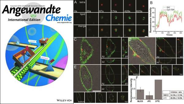 DNA纳米技术为纳米药物载体、纳米机器人研究提供了一系列强大的工具,已逐渐成为一种纳米医学研究的热点。近日,中国科学院上海应用物理研究所物理生物学研究室及上海光源生物成像中心樊春海和黄庆研究员合作,应用一系列先进的细胞显微成像技术并结合生物化学手段,清晰展示了一类自组装DNA四面体结构在活细胞中的摄取与转运过程,为其在药物载运和治疗方面的应用奠定了良好的基础。相关研究结果以封面论文的形式发表于《德国应用化学》杂志(Angew. Chem. Int. Ed. 2014, 53,7745-7750)。