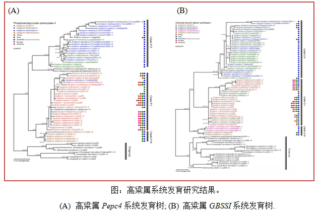 中国科学院华南植物园植物科学研究中心刘青副研究员及硕士研究生刘欢与史密斯桑尼亚研究所Paul M. Peterson教授组成的研究团队,对高粱族内有柄小穗梯度简化的高粱属及其近缘类群进行系统发育研究。结果显示高粱属的分子系统学范畴扩大,高粱属包括3个遗传谱系(即高粱谱系、多毛高粱-异高粱谱系、有柄高粱谱),有柄小穗完全退化的单型属 (Cleistachne Benth.) 位于高粱谱系内部,结合籽实学和分子系统学的研究结果,研究人员将该属转隶至高粱属内—Sorghum sorghoides (Benth.) Q. Liu & P.M. Peterson。首次发现四倍体物种Sorghum sorghoides杂交起源的核基因证据。东非裂谷 (Great Rift Valley, GRV) 是禾本科碳四植物的重要分化中心之一,中新世以来地壳断裂运动使东非形成东、西两支南北走向的裂谷,采用分子钟方法估测高粱属谱系分化大约发生在12.7百万年前,推测中新世中期至上新世时期,东非裂谷持续隆升产生的片段化生境促进高粱属在热带东非分化。该研究为禾本科作物类群物种形成机制和多倍体起源研究积累素材。
