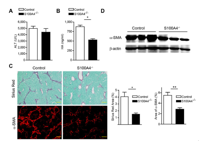 图示:S100A4基因缺失能够显著减轻肝纤维化症状