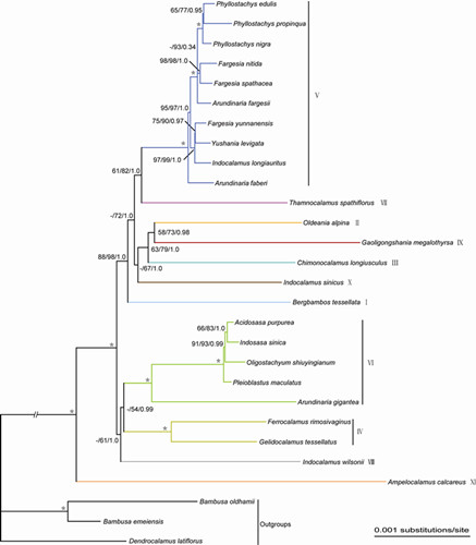 温带竹类11个主要支系之间的系统发育关系(学名后的罗马数字为温带竹子主要支系的编号)
