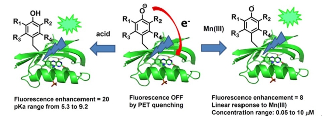 基因编码和荧光蛋白传感器是生物学研究中的重要技术手段。在过去的几十年中,人们已经开发出多种荧光蛋白传感器,用于监测金属离子,pH值,第二信使和翻译后修饰,这对于解析它们在体内信号转导网络中的作用是至关重要的。这些荧光蛋白传感器通常依赖于荧光共振能量转移或者绿色荧光蛋白GFP荧光团酚基的质子化/去质子化来发挥作用。尽管它们现在已被广泛应用,但是在分析物结合前后,这些荧光蛋白传感器的荧光强度变化通常都在两倍以内。相比之下,光致电子转移(photo-induced electron transfer,简称PET)机制开始越来越广泛地被引用到荧光传感器设计中来,最重要的原因在于分析物结合前后,荧光蛋白传感器可以展现出显著的荧光强度变化(通常可以增强10至100倍)。PET同时也是光合作用中的主要反应,PET过程广泛存在于生物系统中,如细胞色素c氧化酶、核苷酸还原酶、DNA光解酶等,其对磁感应等生物过程也具有非常重要的意义。