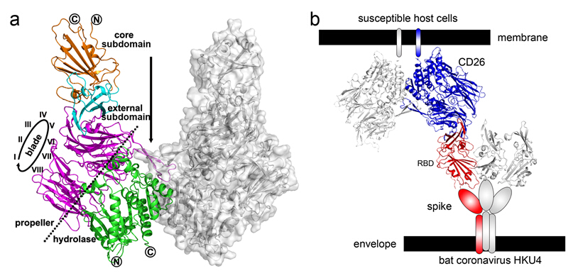 HKU4-RBD/hCD26复合物的晶体结构以及蝙蝠冠状病毒HKU4与细胞表面hCD26结合的分子模式图